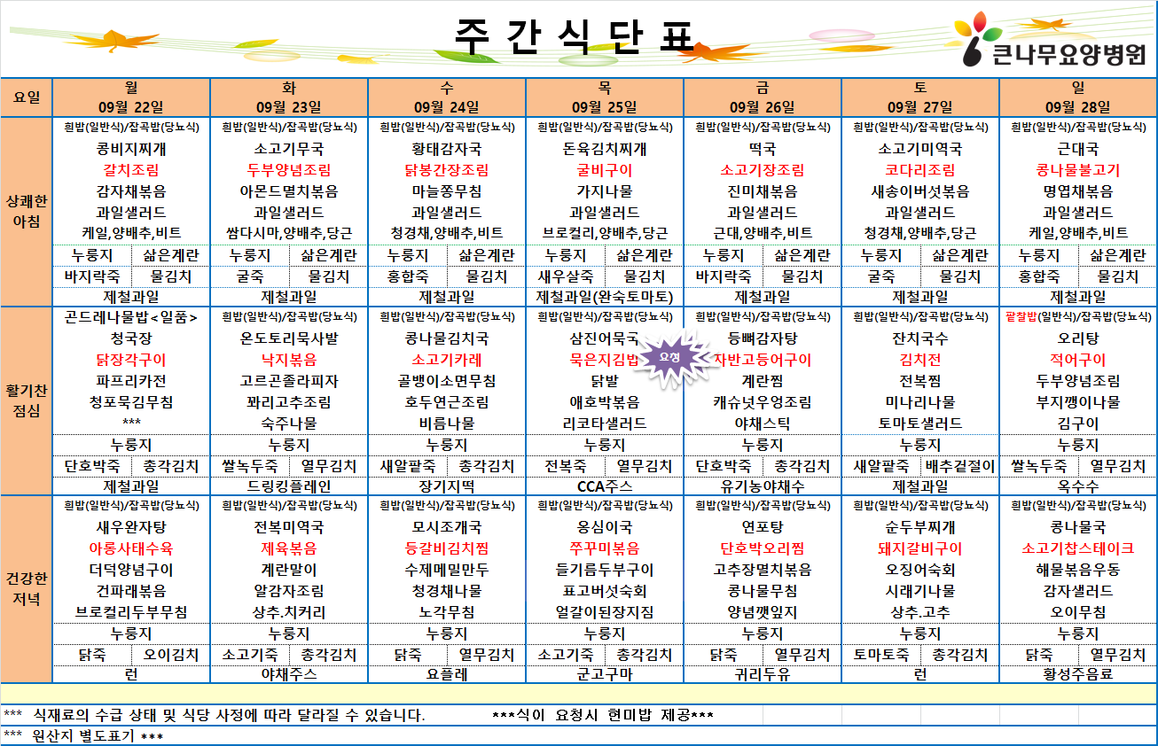 큰나무 암요양병원의 2025년 9월 4주차 식단표를 살펴보도록 하겠습니다.
