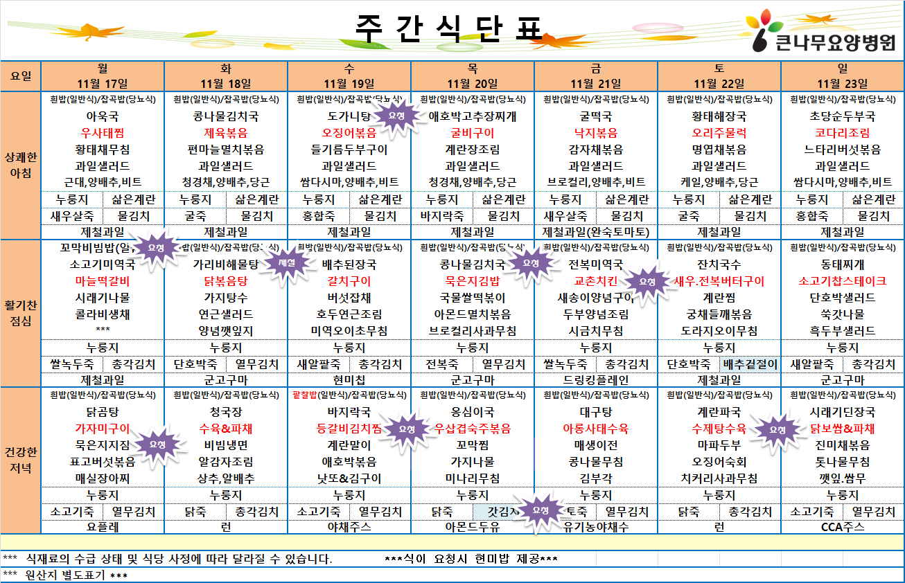 큰나무 암요양병원의 2025년 11월 3주차 식단표를 살펴보도록 하겠습니다.