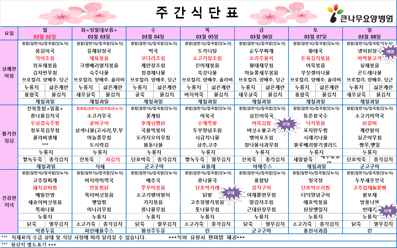 큰나무 암요양병원의 2026년 3월 1주차 식단표를 살펴보도록 하겠습니다.