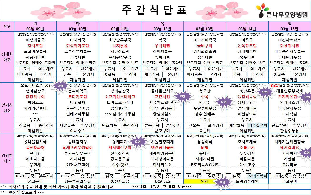 큰나무 암요양병원의 2026년 3월 2주차 식단표를 살펴보도록 하겠습니다.